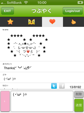みんなの顔文字辞典に収録されている顔文字を1回タップするとコピーされるので、そのまま簡単にメッセージや投稿の記入欄に貼り付けられます。また、TwitterやFacebookのアカウントを連動させると、アプリ内で投稿文が作成できます。画面をわざわざ切り替えずにラクラクと投稿できるので、TwitterとFacebookでよく投稿する人は、ぜひ連動させると良いでしょう。
