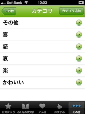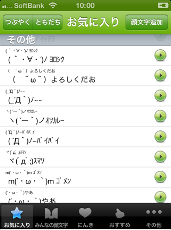 みんなの顔文字辞典の「お気に入り」には、喜怒哀楽などのカテゴリー別に多くの顔文字が既に収録されています。「お気に入り」にない顔文字を追加したい場合は、「みんなの顔文字」「にんき」「おすすめ」からお好みの顔文字を探すと良いでしょう。また、自分で作成した顔文字も登録できるので、文字や記号を組み合わせて独自で作ったものや、ウェブサイト上で見つけたものを登録して活用することもできます。